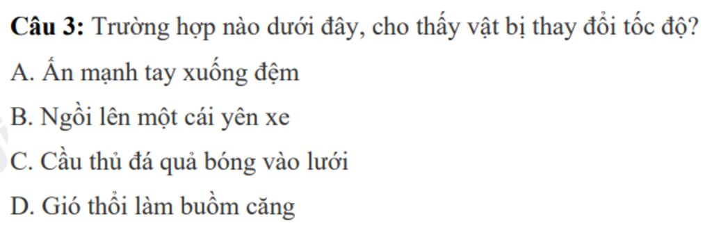 A. Ấn mạnh tay xuống đệm `->` Lực làm cho đệm bị biến dạng
