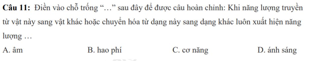`@` Khi năng lượng chuyển hóa từ dạng này sang dạng khác hoặc truyền từ vật này sang vật khác luôn xuất hiện năng lượng hao phí.
