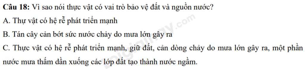 `-` Thực vật có vai trò bảo vệ đất và nguồn nước vì thực vật có hệ rễ phát triển mạnh, giữ đất, cản dòng chảy do mưa lớn gây ra, một phần nước mưa thấm dần xuống các lớp đất tạo thành nước ngầm dưới lòng đất