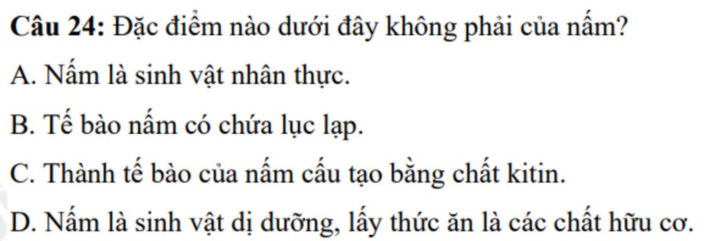 `@` Nấm là sinh vật nhân thực , được tạo từ thành tế bào của nấm cấu tạo bằng chất kitin và là sinh vật dị dưỡng, lấy thức ăn là các chất hữu cơ.