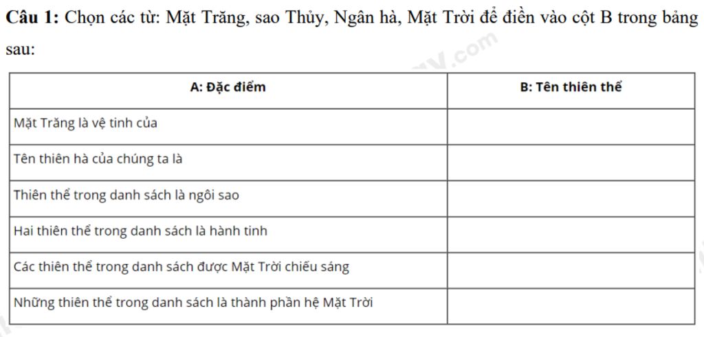Những thiên thể trong danh sách là thành phần hệ Mặt Trời : Mặt Trời, Trái Đất, Mặt Trăng, Sao Thủy