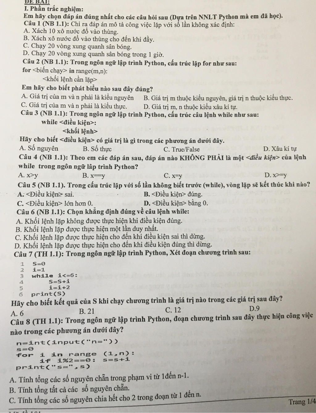 Em hãy chọn đáp án đúng nhất cho các câu hỏi sau (Dựa trên NNLT Python mà em đã học).