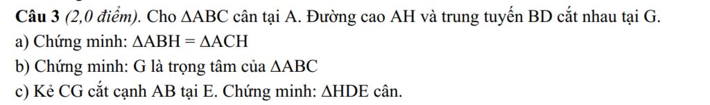Câu 3 (2,0 điểm). Cho $\triangle$ABC cân tại A. Đường cao AH và trung tuyến BD cắt nhau tại G.