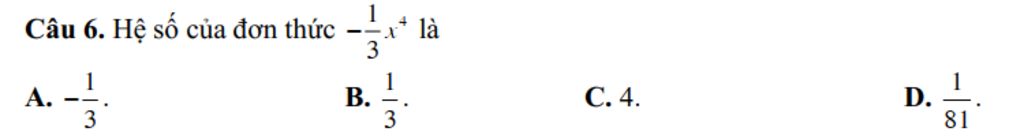 Đơn thức `-1/3x^3` có hệ số là `-1/3`
