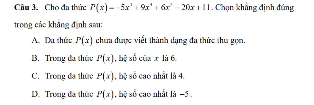 `D.` Trong đa thức `P(x),` hệ số cao nhất là `-5`
