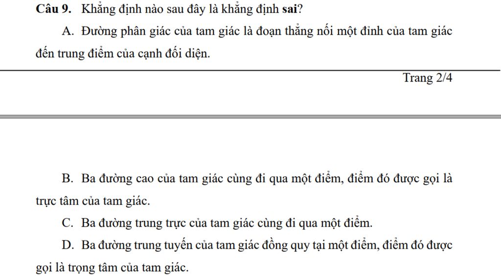 `A.` Sai vì đường trung tuyến mới là đoạn thẳng nối một đỉnh của tam giác đến trung điểm của cạnh đối diện.