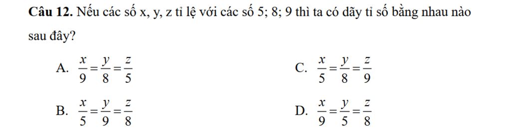Câu 12. Nếu các số x, y, z tỉ lệ với các số 5; 8; 9 thì ta có dãy tỉ số bằng nhau nào