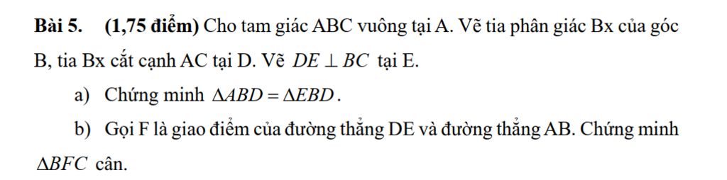 Bài 5. (1,75 điểm) Cho tam giác ABC vuông tại A. Vẽ tia phân giác Bx của góc B, tia Bx cắt cạnh AC tại D. Vẽ DE L BC tại E.