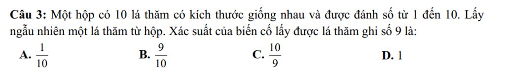 Câu 3: Một hộp có 10 lá thăm có kích thước giống nhau và được đánh số từ 1 đến 10. Lấy ngẫu nhiên một lá thăm từ hộp. Xác suất của biến cố lấy được lá thăm ghi số 9 là: