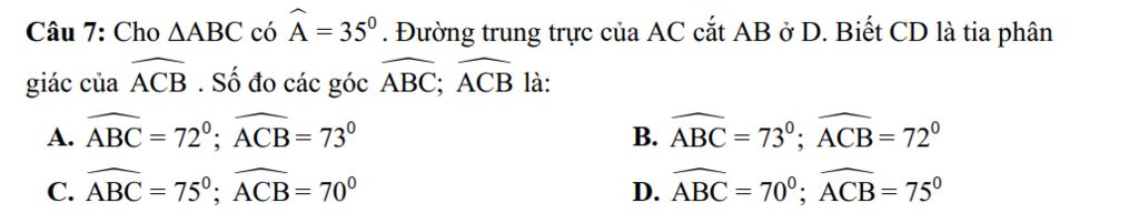 Câu 7: Cho $\triangle$ABC có $\widehat{A}$= 35° . Đường trung trực của AC cắt AB ở D. Biết CD là tia phân giác của $\widehat{ACB}$ . Số đo các góc $\widehat{ABC}$; $\widehat{ACB}$ là:
