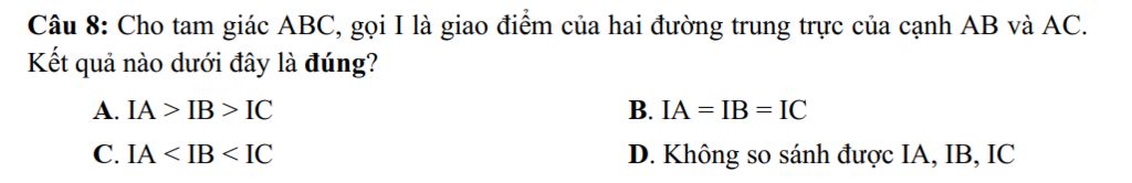 mà `I` là giao điểm `2` đường trung trực `AB` và `AC` trong `\DeltaABC`