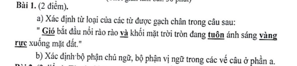 `b)` Câu : "Gió bắt đầu nổi rào rào và khối mặt trời tròn đang tuân ánh sáng vàng rực xuống mặt đất. "