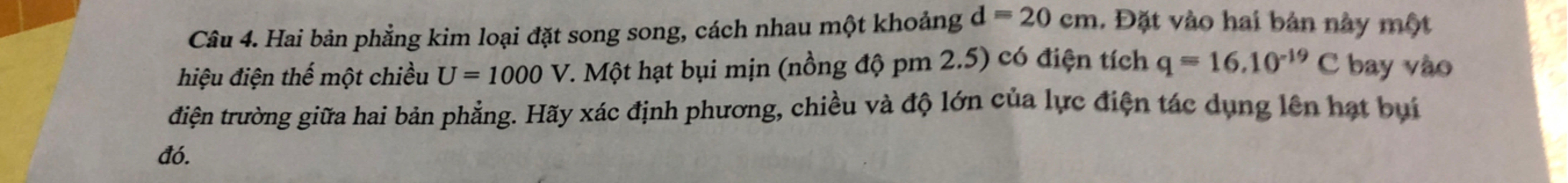 Vì hạt bụi chỉ bay vào điện trường (coi như không vận tốc đầu) nên sẽ di chuyển theo phương thẳng đứng, khi đó `\vec{F_đ}` có phương thẳng đứng, mà `q>0` nên `\vec{F_đ}` cùng chiều với `\vecE`, tức là có chiều đi từ bản dương sang bản âm