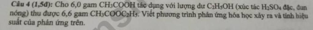 `CH_3COOH + C_2H_5OH` $\buildrel{{H_2SO_4 đặc,t^o}}\over\rightleftharpoons$ `CH_3COOC_2H_5 + H_2O`