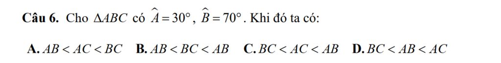 `@` Có `triangle ABC` có `hatC=180^@-30^@-70^@=80^@`