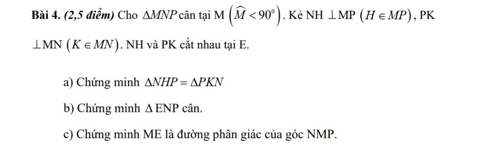 Bài 4. (2,5 điểm) Cho AMNP cân tại M (M <90°). KẻNH LMP (H =MP), PK