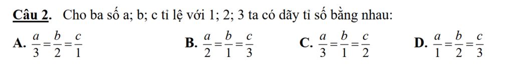 `@` Cho ba số `a;b;c` tỉ lệ với `1;2;3` ta có dãy tỉ số sau: