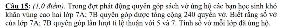 Vậy số vở hai lớp `7A,7B` đã ủng hộ lần lượt là `100;140` quyển vở.