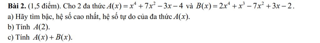 Trong đa thức `A(x)` hạng tử có bậc cao nhất là `x^4` nên bậc của đa thức `A(x)` là `4` hệ số cao nhất là `1` và hệ số tự do là `-4`