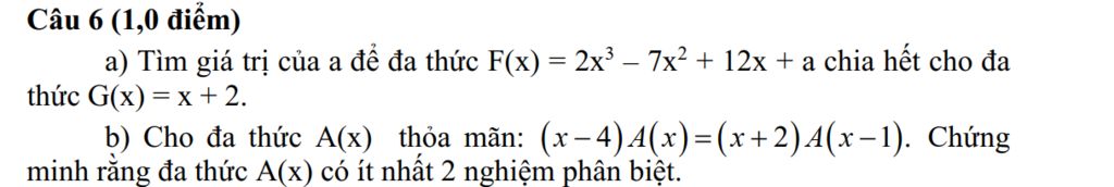 b) Cho đa thức A(x) thỏa mãn: $(x−4)A(x)=(x+2)A(x−1)$. Chứng minh rằng đa thức A(x) có ít nhất 2 nghiệm phân biệt.
