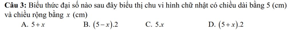 Câu 3: Biểu thức đại số nào sau đây biểu thị chu vi hình chữ nhật có chiều dài bằng 5 (cm)