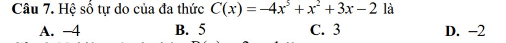 `@` Đa thức `C(x)=-4x^5 + x^2 + 3x-2` có hệ số tự do à `-2`