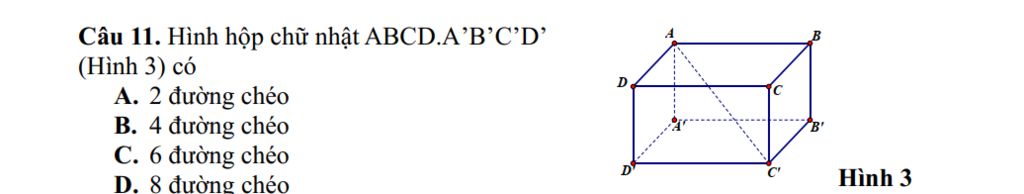 Hình hộp chữ nhật `ABCD.A'B'C'D'` có số đường chéo là `4` đường chéo `=>` `B`