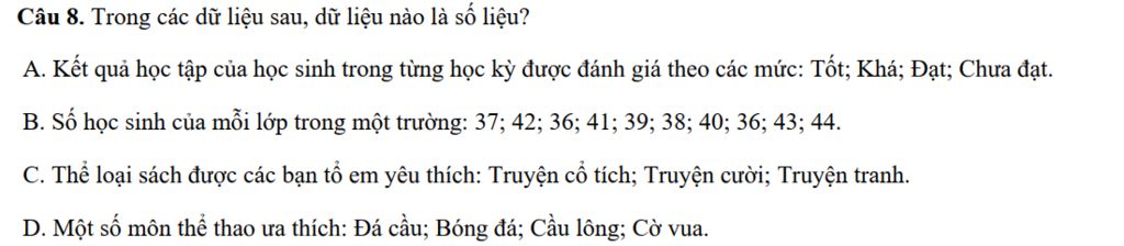 Câu 8. Trong các dữ liệu sau, dữ liệu nào là số liệu?