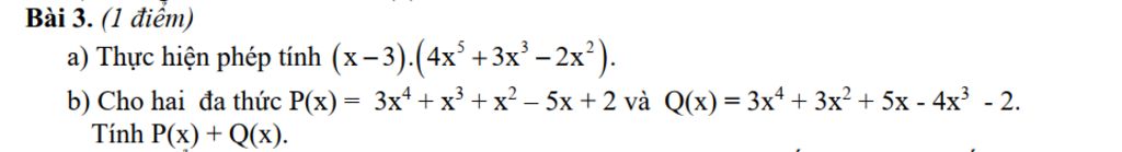 Ta có: `P(x) + Q(x) = (3x^4 + x^3 + x^2 - 5x + 2) + (3x^4 + 3x^2 + 5x - 4x^3 - 2)`