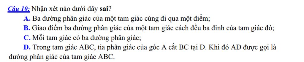 - Giao điểm ba đường phân giác của một tam giác cách đều ba cạnh của tam giác đó.