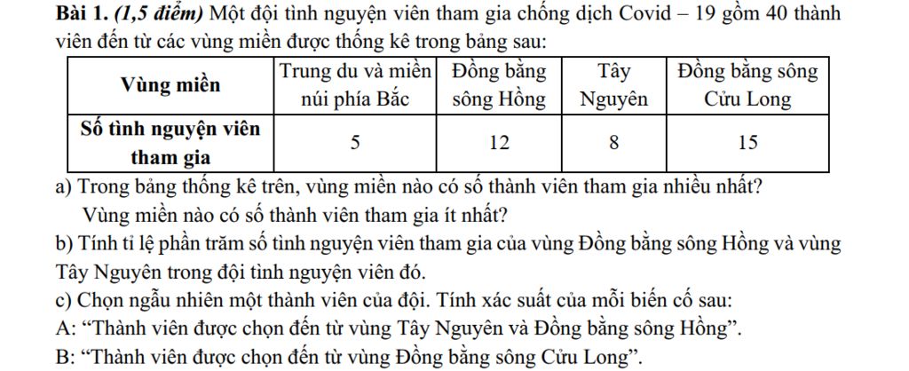 `b)` Tỉ lệ phần trăm số tình nguyện viên tham gia của vùng Đồng bằng sông Hồng và vùng Tây Nguyên trong đội tình nguyện viên đó là :