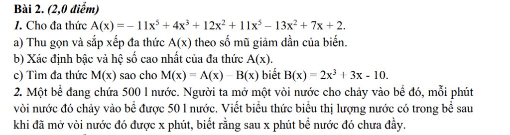 1. Cho đa thức A(x) = $11x^5+ 4x^3 + 12x^2 + 11x^5 - 13x^2+7x+2$