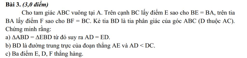 Cho tam giác ABC vuông tại A. Trên cạnh BC lấy điểm E sao cho BE = BA, trên tia BA lấy điểm F sao cho BF = BC. Kẻ tia BD là tia phân giác của góc ABC (D thuộc AC).