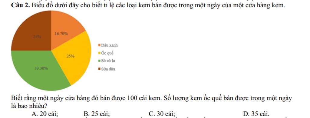 Câu 2. Biểu đồ dưới đây cho biết tỉ lệ các loại kem bán được trong một ngày của một cửa hàng kem.