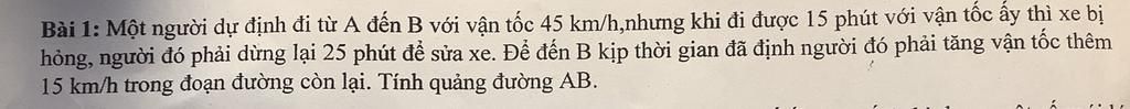 Bài 1: Một người dự định đi từ A đến B với vận tốc 45 km/h,nhưng khi đi được 15 phút với vận tốc ấy thì xe bị