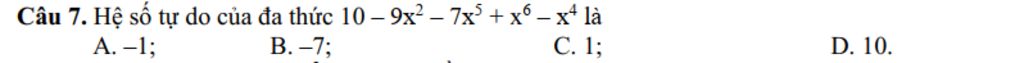 `10-9x^2 - 7x^5 + x^6 - x^4` có hệ số tự do à `10`