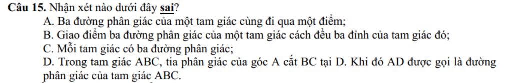 `B.` Sai vì giao điểm ba đường phân giác của một tam giác cách đều ba cạnh của tam giác đó