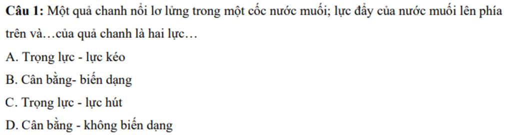 Một quả chanh nổi lơ lửng trong một cốc nước muối; lực đẩy của nước muối lên phía trên và…của quả chanh là hai lực…