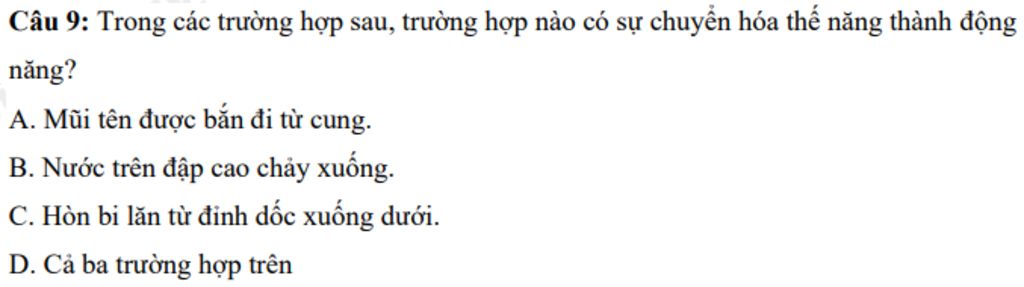 `-` Giải thích : Mũi tên được bắn đi từ cung: thế năng đàn hồi `->` động năng. Nước trên đập cao chảy xuống, hòn bi lăn từ đỉnh dốc xuống dưới: thế năng hấp dẫn `->` động năng