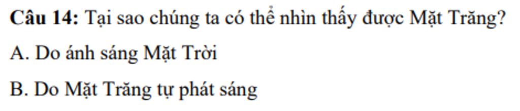 `@`Chúng ta có thể nhìn thấy được Mặt Trăng vì ánh sáng của Mặt Trời vì khi Mặt Trăng quay quanh Trái Đất, ánh sáng Mặt Trời chiếu vào Mặt Trăng, làm nó trở nên sáng lên