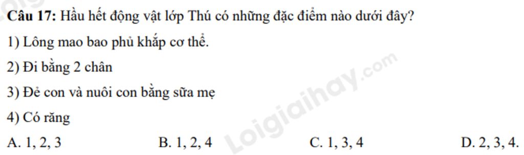 `-` Giải thích : Hầu hết động vật lớp Thú có những đặc điểm là : lông mao bao phủ khắp cơ thể, đẻ con và nuôi con bằng sữa mẹ và có răng.