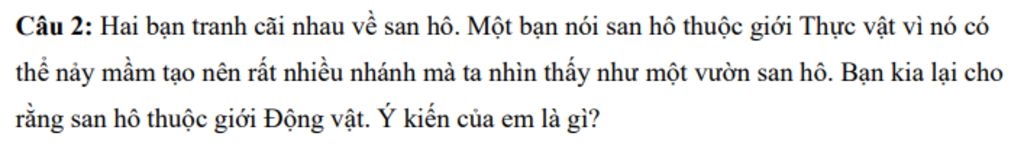Câu 2: Hai bạn tranh cãi nhau về san hô. Một bạn nói san hô thuộc giới Thực vật vì nó có thể nảy mầm tạo nên rất nhiều nhánh mà ta nhìn thấy như một vườn san hô. Bạn kia lại cho rằng san hô thuộc giới Động vật. Ý kiến của em là gì?
