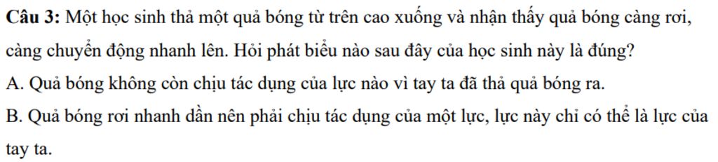 `-` Một học sinh thả một quả bóng từ trên cao xuống và nhận thấy quả bóng càng rơi, càng chuyển động nhanh lên thì : quả bóng đã được thả ra nên không còn chịu tác dụng của lực tay,tuy nhiên quả bóng rơi nhanh dần nên phải chịu tác dụng của một lực, lực này không thể là lực của tay ta mà là một lực khác lên quả bóng