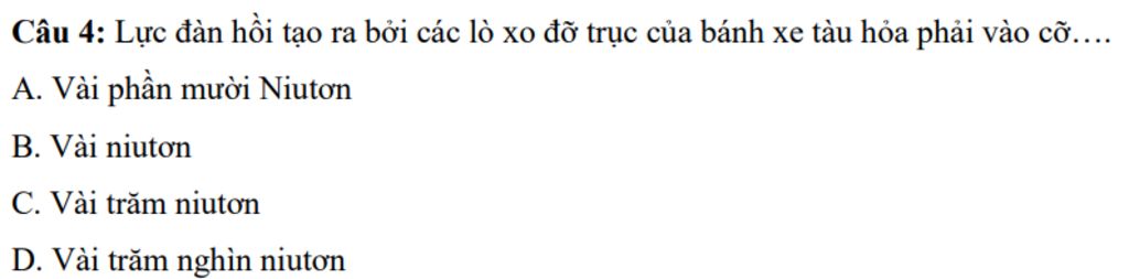`->` Lực đàn hồi tạo ra bởi các lò xo đỡ trục của bánh xe tàu hỏa thường nằm trong khoảng vài trăm nghìn niutơn.
