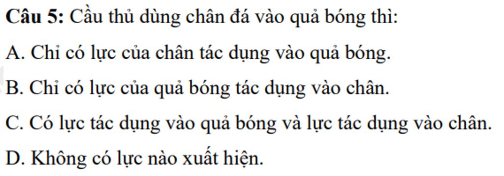 Câu 5: Cầu thủ dùng chân đá vào quả bóng thì: