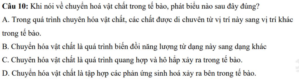 Câu 10: Khi nói về chuyển hoá vật chất trong tế bào, phát biểu nào sau đây đúng?