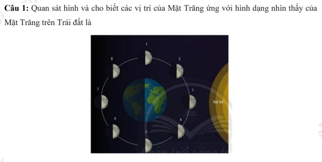 Câu 1: Quan sát hình và cho biết các vị trí của Mặt Trăng ứng với hình dạng nhìn thấy của Mặt Trăng trên Trái đất là?( $\text{ pha trăng}$)