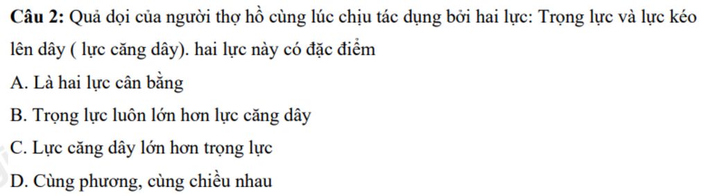 Câu 2: Quả dọi của người thợ hồ cùng lúc chịu tác dụng bởi hai lực: Trọng lực và lực kéo lên dây (lực căng dây). hai lực này có đặc điểm