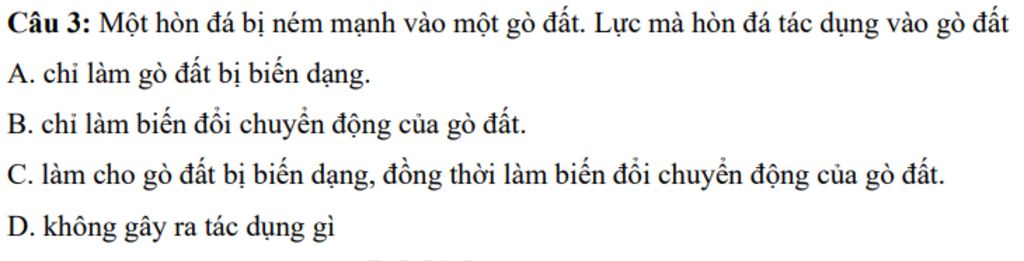 Câu 3: Một hòn đá bị ném mạnh vào một gò đất. Lực mà hòn đá tác dụng vào gò đất