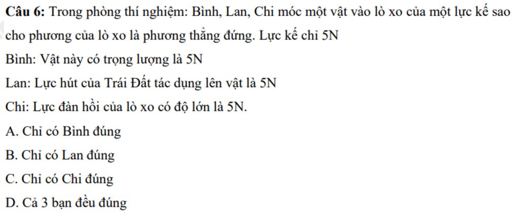 Câu 6: Trong phòng thí nghiệm: Bình, Lan, Chi móc một vật vào lò xo của một lực kế sao cho phương của lò xo là phương thẳng đứng. Lực kế chỉ 5N